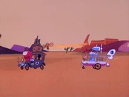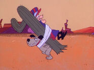 Vying for the lead, The Buzzwagon cuts The Bulletproof Bomb in half. The Ant Hill Mob zip their car back together and continue. Dastardly and Muttley erect a fake railroad crossing to stall the others, but a train runs him over. The Chief arrives in a tepee on wheels and ties the do-badders to a cactus, but The Gruesome Twosome run over him again and he runs away. Muttley picks up the cactus and Dastardly and runs.