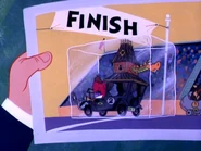 The Gruesome Twosome use dragon power to keep the Professor from passing, but he cools them off with a freeze ray. While they're tussling, The Arkansas Chug-a-Bug uses barefoot bear power to pass them both. A dense fog confuses the racers, but an infrared photo finish shows the still-frozen Creepy Coupe slid across the finish line first.